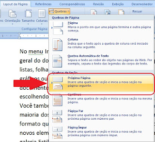 Clique na guia LAYOUT DA PAGINA, escolha a opção QUEBRA e clique em PROXIMA PAGINA. O ideal é fazer a quebra da pagina com o curso no final da pagina para que nenhuma parte do texto seja separada.